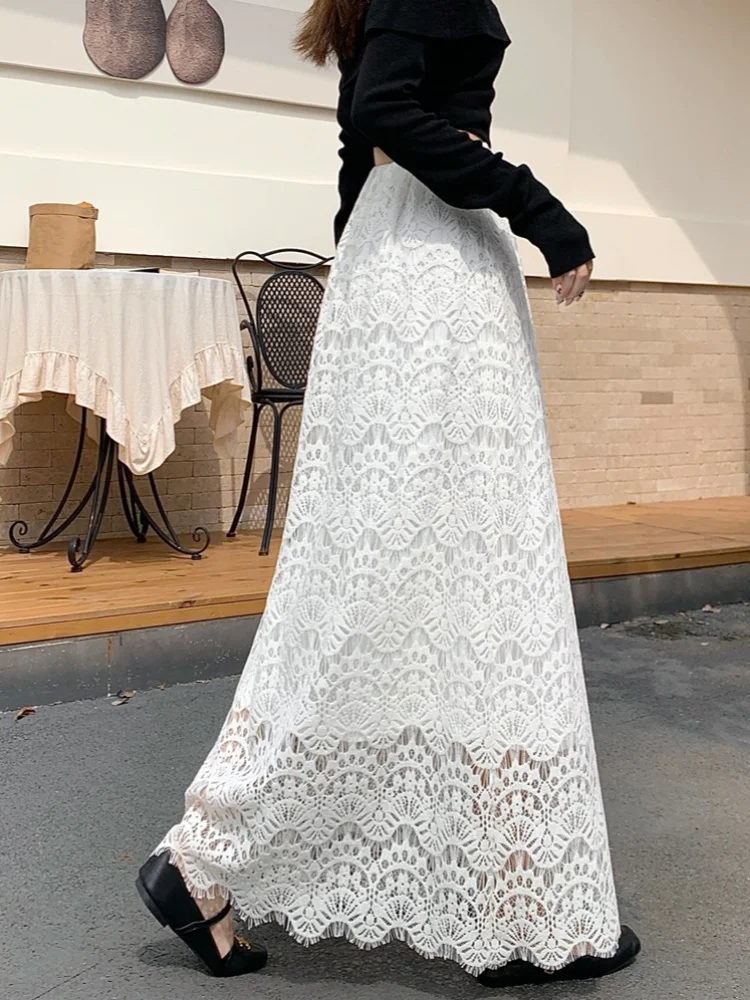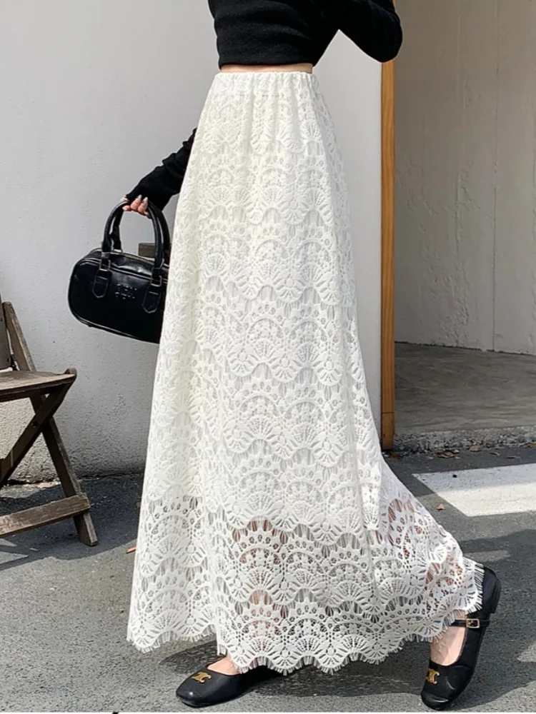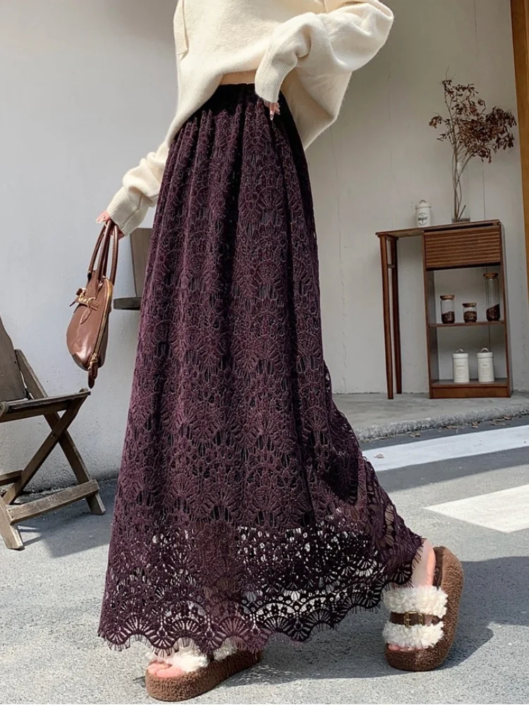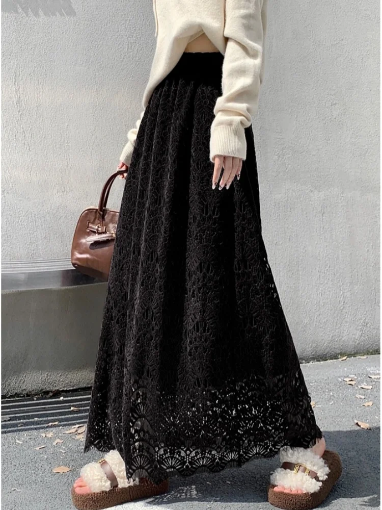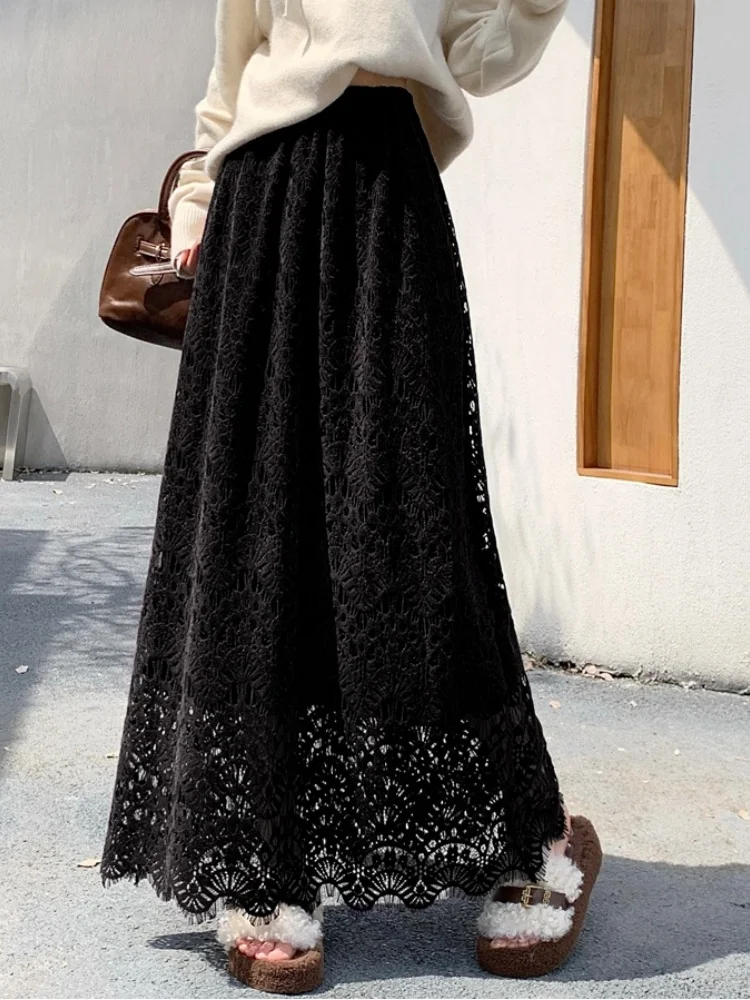 Cheap And Discount French Elegant Mid-Length Skirt For Women 2025 New Autumn Winter Lace Hollow Out A-line Skirt High Waist Temperament Long Skirt Wholesale. Buy Directly From SMTHMA Official Store.